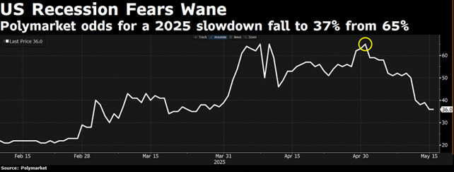 Il tema dominante sui mercati riguarda la sorprendente de-escalation nella guerra commerciale tra Stati Uniti e Cina; un cambiamento di rotta che ha colto i mercati quasi di sorpresa, e che ha spinto analisti e investitori a ricalibrare le proprie aspettative. Dopo settimane di tensione, la narrazione si è improvvisamente ammorbidita e le probabilità di una recessione negli Stati Uniti sono state riviste al ribasso da molte grandi case d’investimento: Goldman Sachs le ha ridotte dal 45% al 35%, JP Morgan ora le stima «al di sotto del 50%», e Polymarket è passato dal 51% di venerdì scorso al 37%.