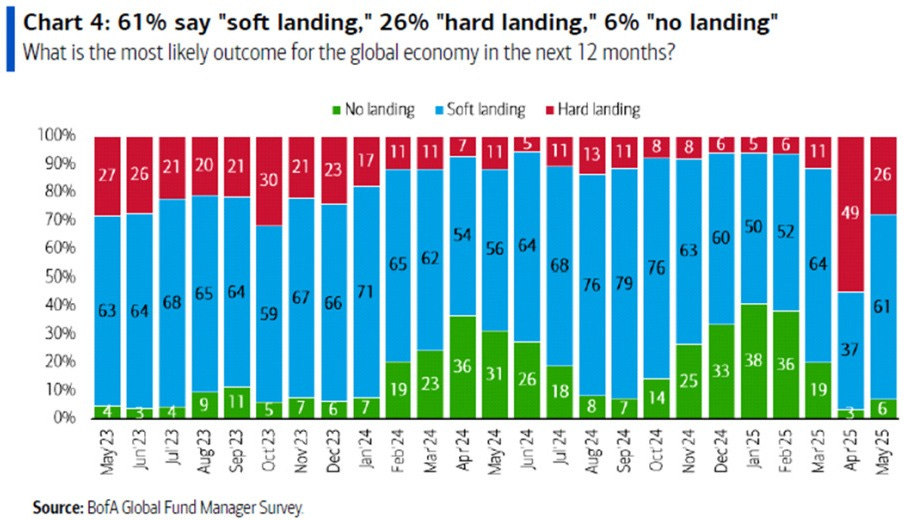 Le stesse indicazioni di distensione arrivano anche dalla Fund Management Survey di Bank of America per il mese di Maggio, dove il soft landing è tornato per il 61% degli intervistai ad essere atteso come lo scenario principale, in contrasto con le aspettative di una recessione attesa nel mese scorso dal 41% degli intervistati.
