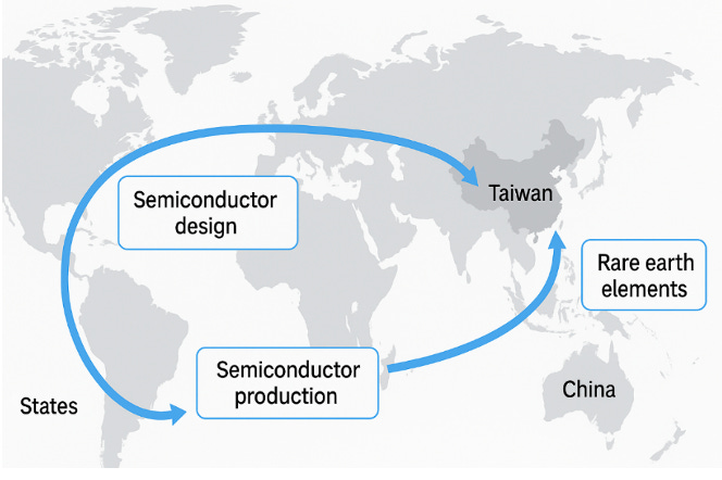 La filiera dei semiconduttori è fortemente globalizzata. Progettazione USA, produzione Taiwan/Corea, materiali Cina/Giappone, attrezzature Europa/USA, assemblaggio Sud-Est asiatico. Basta un blocco in una sola area per creare colli di bottiglia globali (es. crisi chip 2021). Attualmente infatti nessun Paese risulta essere autonomo nella filiera dei Semiconduttori.
