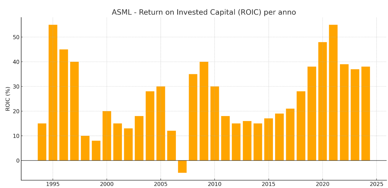 La leadership di ASML è evidenziata da un Ritorno sul capitale sempre superiore al 20% e negli ultimi anni al 40%