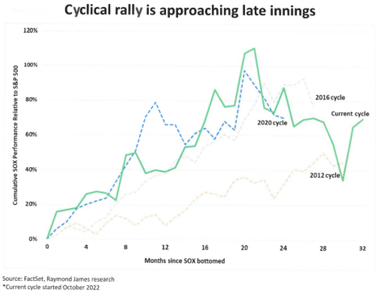 Se confrontiamo l’attuale ciclo dei semiconduttori con i passati, e lo vediamo con l ‘indicatore della performance cumulata e del numero dei mesi dal minimo notiamo che l’attuale ciclo è più lungo dei precedenti.